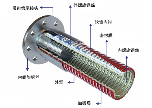 軟管管體(tǐ)由多(duō)層功能性聚合物膜及合成纖維織物加強層構成,內(nèi)外兩層螺旋金屬線纏繞堅固。